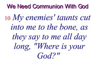 As with a sword in my bones mine enemies reproach me. As the deer pants for streams of water so my soul pants for you my God. Psalm 4210 GODS.